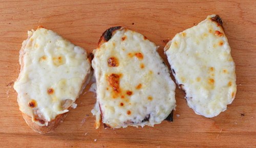 Preheat the broiler in your oven. Place the sliced bread on a cookie sheet lined with parchment or non-stick foil. Lightly toast the bread on one side, then remove it from the oven and spread a generous amount of the cheese sauce on the untoasted side. Make a nice thick layer, spread to the edges. Sprinkle a pinch of flaky salt over the toasties, then place under the broiler. Broil until the cheese is bubbly and lightly browned in spots, about 5 minutes. Watch very carefully and remove as soon as the brown spots appear.