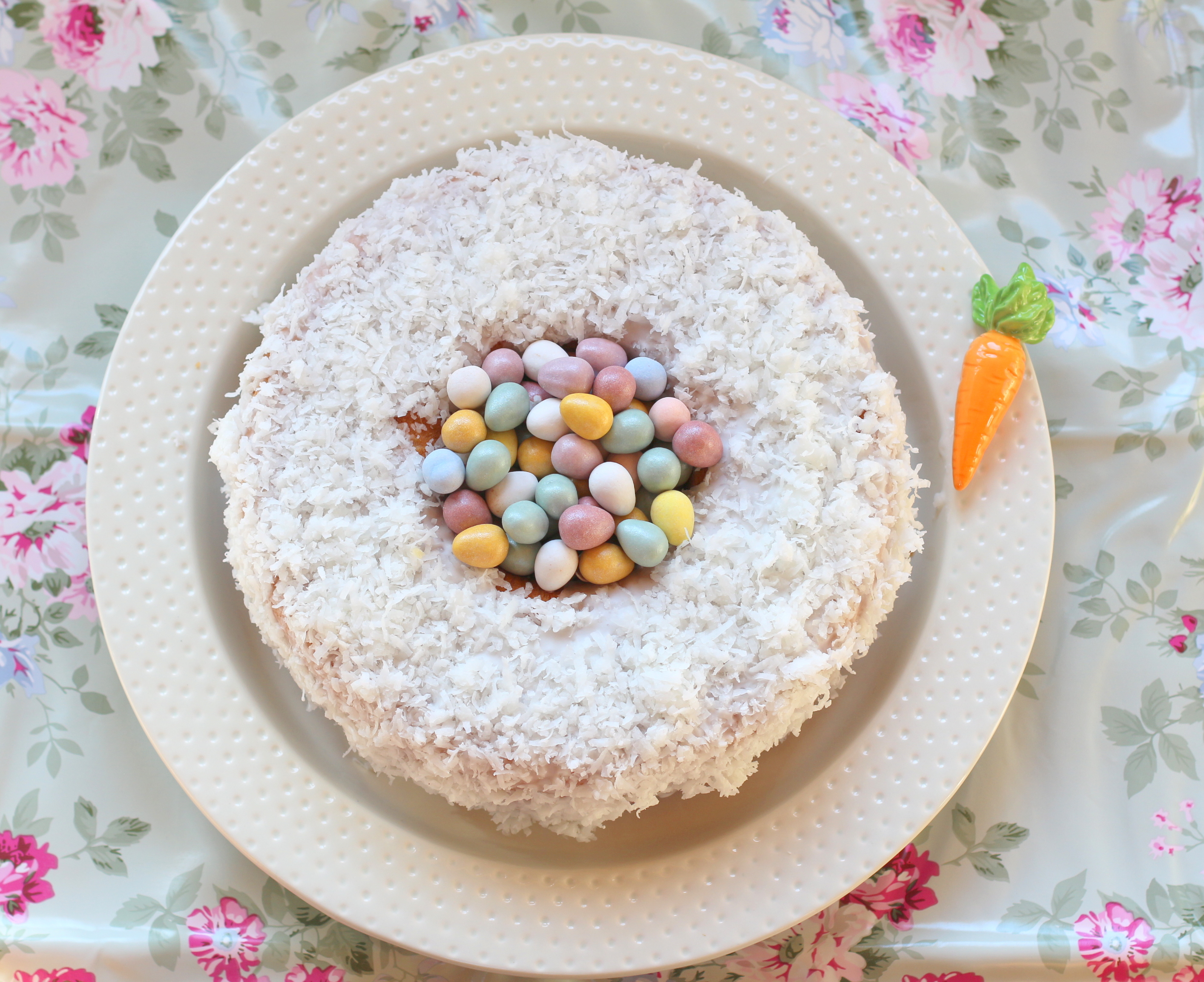 The insane amount of candy available at Easter is astounding, easily rivalling Christmas and Halloween these days. And I’ll admit, I am tempted. I am a sucker for the specialty seasonal treats (carrot cake kisses, anyone?) and many of the Easter variety are terribly cute. I’ve used little candy coated mini eggs as decoration on a number of things as an afterthought, but this year I found some shimmer eggs that were just too beautiful to pass by (they’re from Cadbury). The fluffy coconut coating on the cake makes a lovely spring dessert, and you could certainly serve it at any time without the candy eggs.