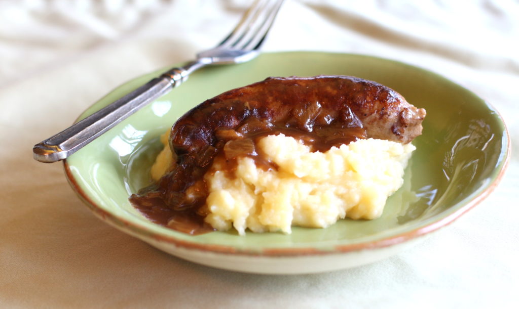 Everyone gets a kick out of the rather silly names of some traditional British food names. Spotted Dick. Toad in the Hole. Bubble and Squeak. And Bangers and Mash. The mash part is pretty obvious (mashed potatoes). Bangers are sausages, and the term supposedly comes from a time when cheap sausages would explode in a hot pan making a bang. I love a good plate of bangers and mash, but too often what you get is not a very good plate. Pubs that have turned to chain restaurants, my old college dining hall, some touristy restaurants serve up tepid, lumpy mash that may very well be instant and fatty, flavorless sausages with gravy made from a mix. That, I do not like. But when treated properly, a hearty dinner of really good sausages, creamy mash and rich gravy is a sight to behold. So I have worked over the years to develop a really good bangers and mash dish.