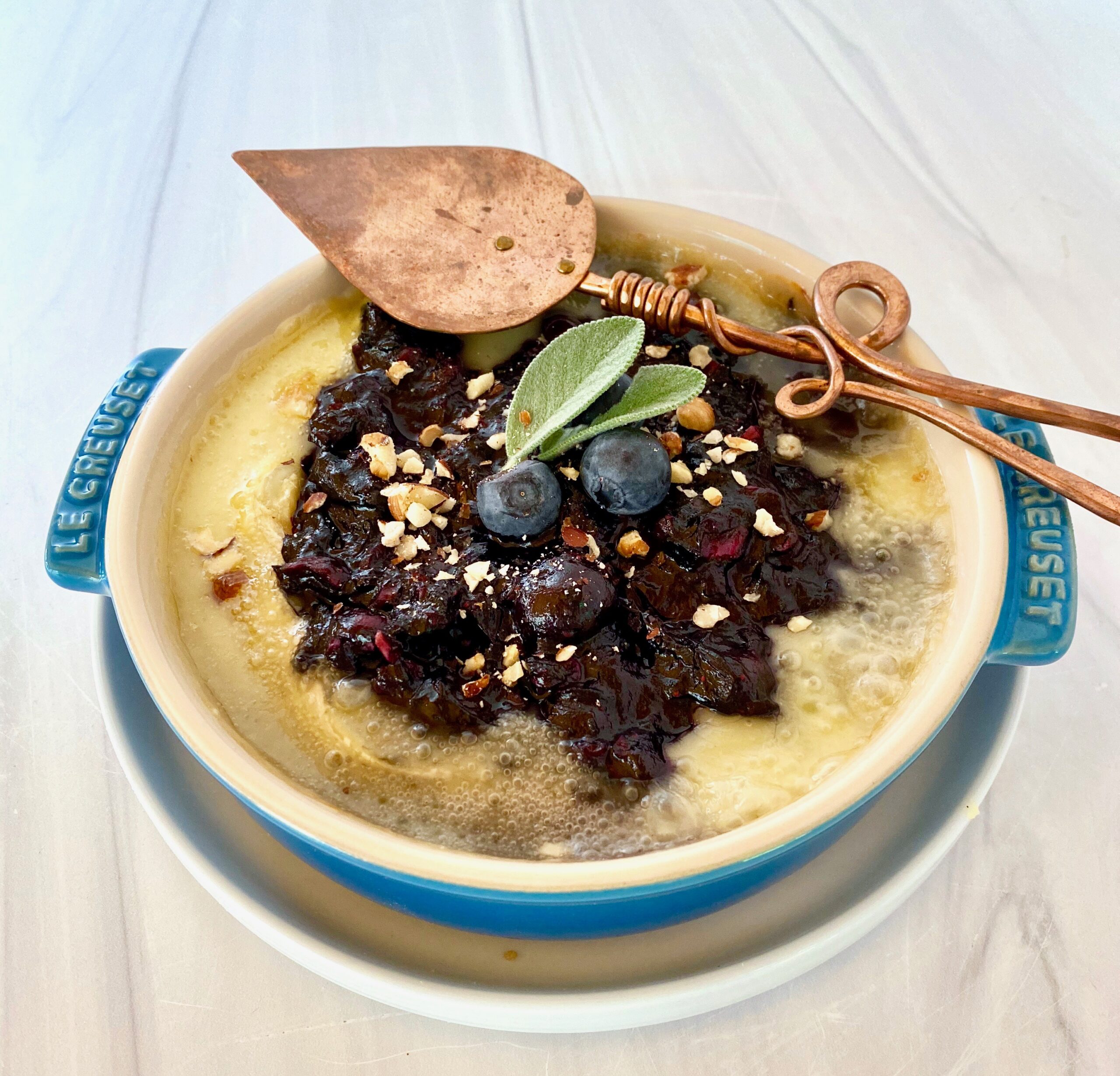 I lay out a certain method here that produces a melted pool of brie and conserve that is almost dippable and I love it that way. Bringing the brie to room temp then cooking it slightly before adding the topping creates this effect. If you prefer your brie just warmed through, simply spoon the berries over the cheese and stick it straight in the oven. I love to stir some berries into the conserve after it has cooked to a jammy thickness to add little pops of texture. Hazelnuts and sage are a really interesting and unique pairing with the blueberries, but tarragon or basil would be equally as good, as would almonds or walnuts. The conserve also works beautifully with camembert
