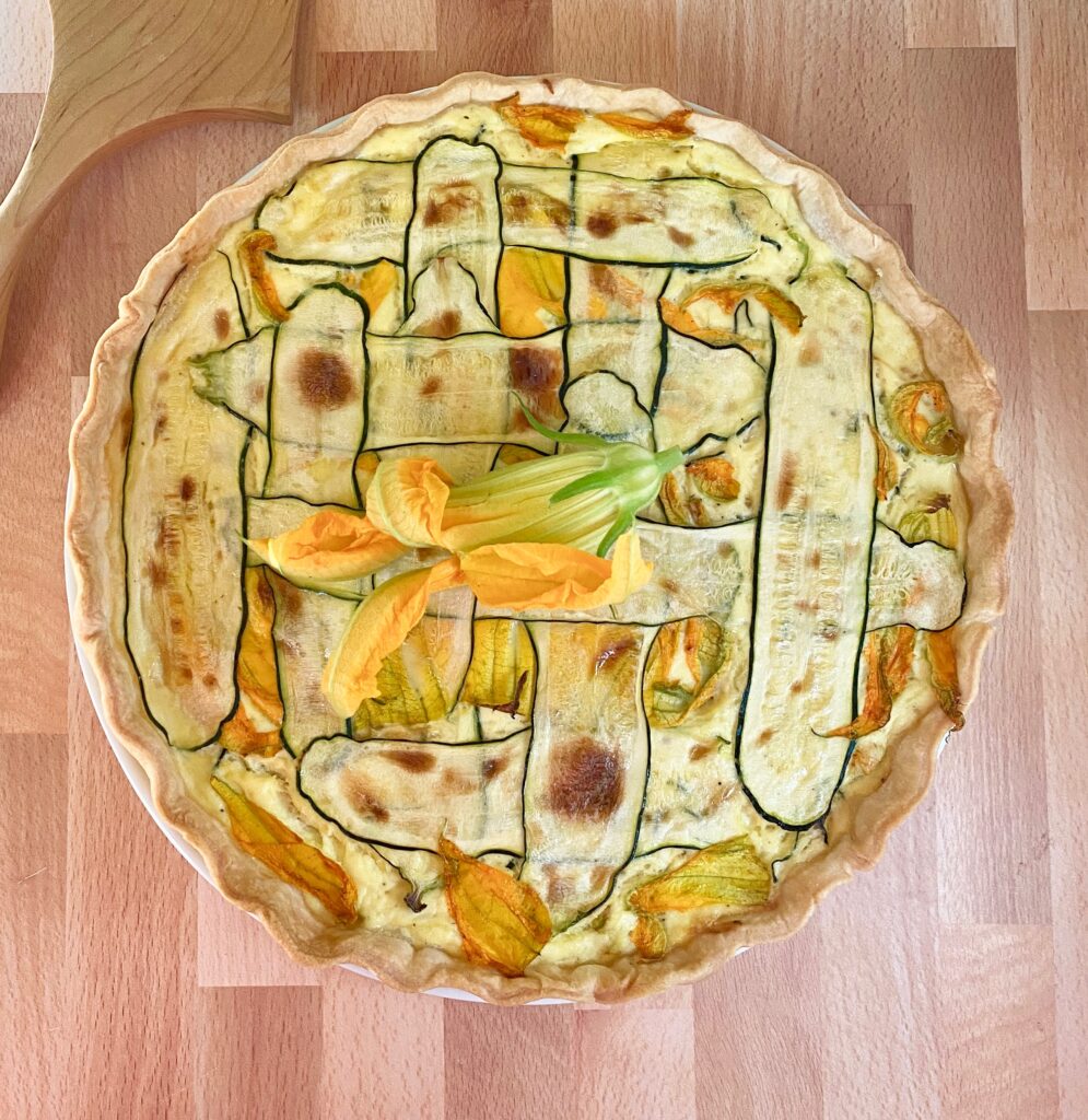- Drain off any liquid in the container with the ricotta. Beat the eggs in a medium bowl, then add the ricotta and beat until smooth and combined. Stir in the zucchini and leek mixture until evenly distributed, then spread into the cooled pastry, filling the shell and smoothing the top. Pat the zucchini ribbons dry on paper towels, then arrange them in a lattice pattern alternating with strips of squash blossom petals. I lay pieces across in one direction, then weave more slices in the other direction, filling the spaces with blossoms and tucking blossoms around the edges.