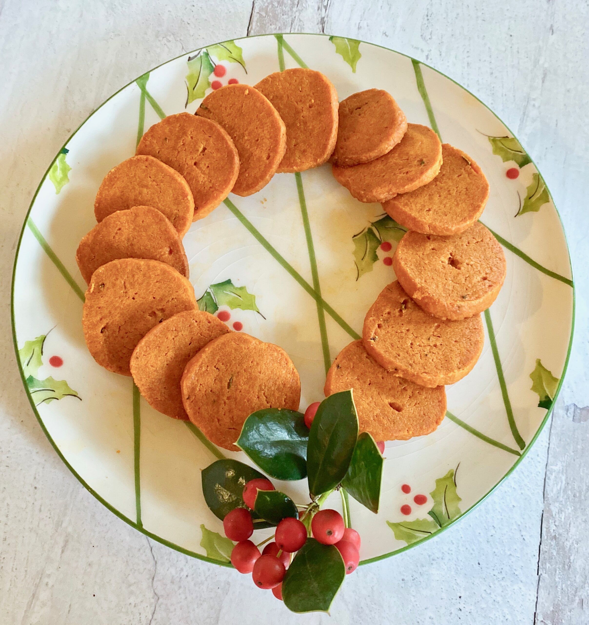 Some time ago, I went a little overboard in a gourmet food shop, buying up all sorts of little French and Italian goodies – the kind of things that tend to linger on a shelf waiting for the “right” time to use them. More often than not, they go bad before the “right” time comes. I bought a tiny little tube with tomato shortbread batons from France. Only after I left the store did I realize I’d paid close to $15 for them, and when I did actually open them, there were maybe 6 little tomato sticks. But I loved the idea and realized I could easily replicate the idea for a fraction of the cost. And here we are. I love these as a vibrantly colored bite during the holidays, and they are easy to arrange in a wreath shape for some extra fun. They are marvelous with a glass of bubbles and an interesting addition to a cheese or charcuterie board.