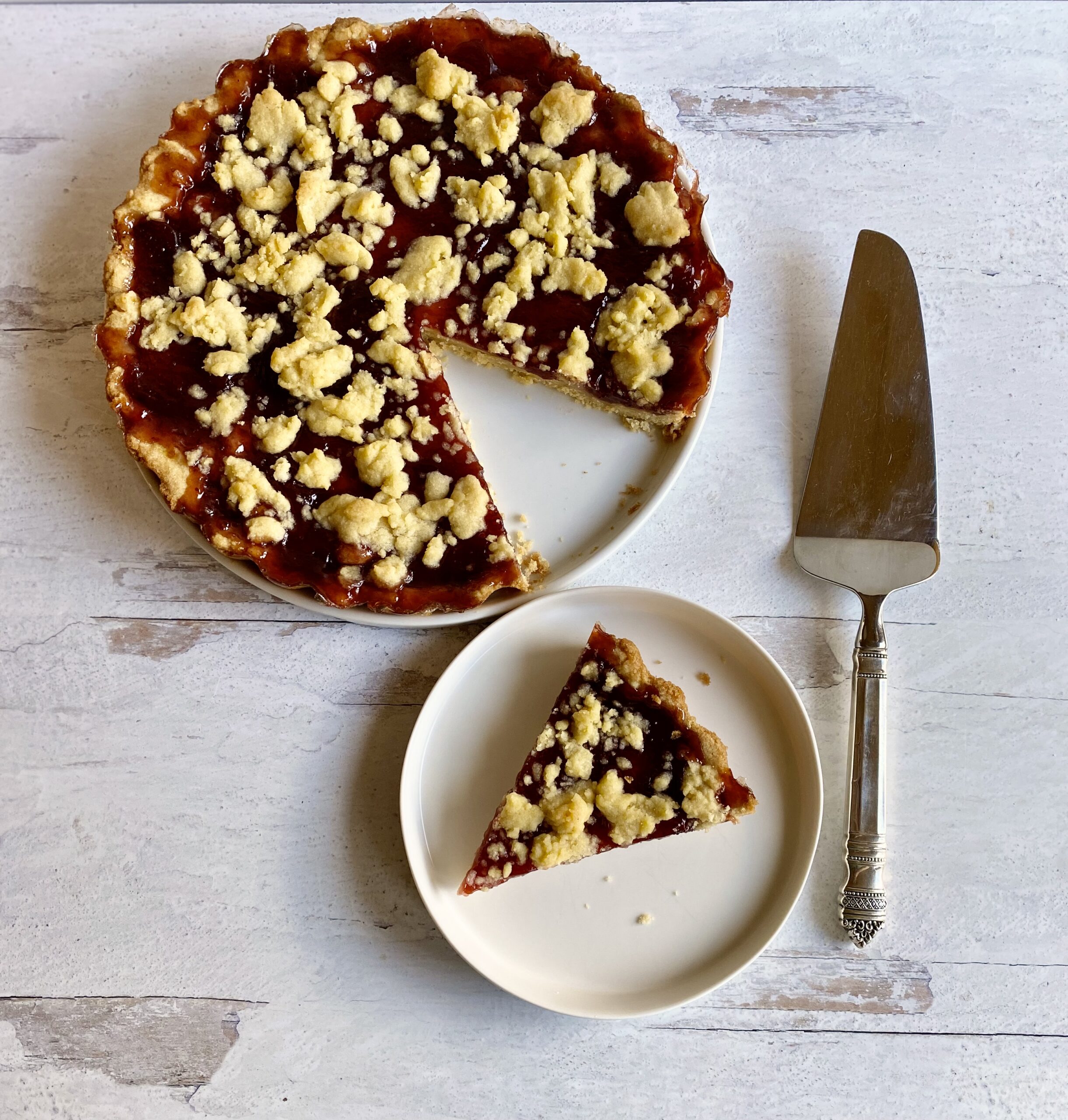 - Bake the tart for 30 – 35 minutes until the preserves are bubbling and the crumble has just the merest hint of golden – you do not want the shortbread crumble browned. Let the tart cool in the pan for 15 minutes then removing the ring. You may need to loosen the edges with a shrp knife where the preserves have cooked. Don’t let the tart cool completely with the ring attached or it will be difficult to remove from any sticky jam spots. The tart can be served barely warm or at room temperature. Wrapped airtight it will keep on the counter for a day.