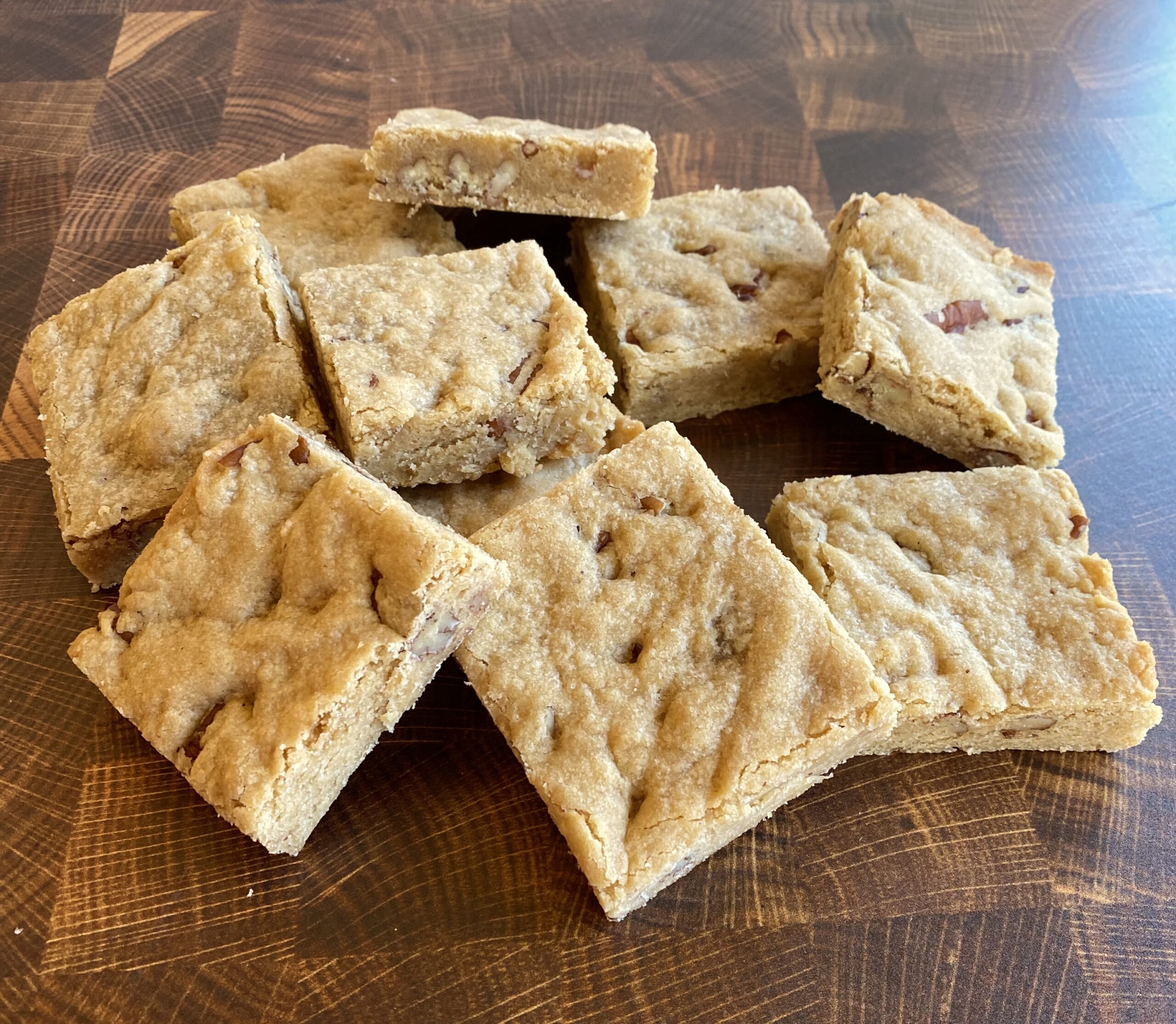 - Put the brown sugar in a large mixing bowl and pour in the brown butter, leaving any dark sediment behind. Stir well to combine. Add the eggs, vanilla and bourbon and stir to completely combine. Add the flour and salt and stir until combined and there are no streaks of dry ingredients left in the bowl. Break up any large pieces of pecan, then stir them into the batter until evenly distributed. Transfer the batter to the prepared pan and press into an even layer filling the pan. Bake for 20 – 22 minutes, until a tester inserted in the center comes out with just a few crumbs clinging to it. Cool completely in the pan, then lift the bar out by the overhanging foil and cut into squares. The bars will keep in an airtight container for 3 days.