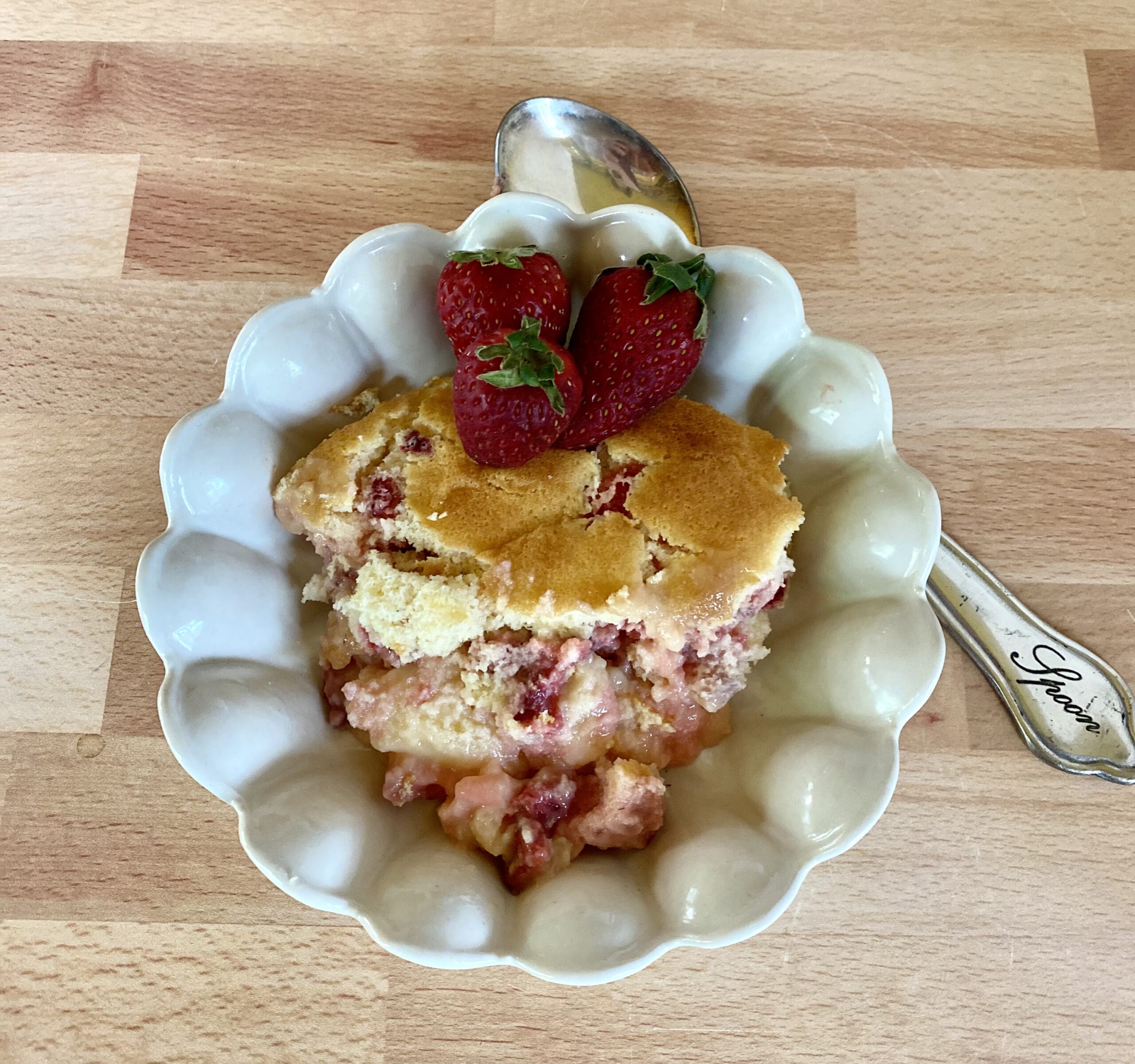 - Beat the butter, ¾ cup sugar and lemon zest together in the bowl of a stand mixer fitted with the paddle attachment (or with a hand mixer) until creamy and light. Separate the eggs, putting the whites in another mixing bowl and adding the yolks ot the butter mixture one at time, beating well after each addition. Add the lemon juice the the tolk mixture and beat to combine, scraping down the sides of the bowl, then add the flour and buttermilk alternately beating until completely combined and smooth, scraping down the sides of the bowl as needed. Remove the bowl from the mixer and gently fold in the strawberry pieces. Switch to the whisk attachment (or clean and dry the hand mixer beaters) then beat the egg whites in the second bowl, streaming the 2 Tablespoons of sugar in until stiff peaks form and the mixture is glossy. Spoon a little of the whites into the yolk mixture and stir to combine, then add the rest of the whites in small additions, carefully and gently folding until the whites are combined, scraping from the bottom of the bowl, but being careful not to deflate the mixture. There should be no visible streaks of white left in the batter, but the mixture should be light an airy. Spoon the batter into the prepared baking dish, set in the roasting pan. Place the pan in the oven, then pour boiling water carefully into the roasting pan (don’t splash in the baking dish) to reach halfway up the sides of the baking dish. Cook for 45 minutes, then carefully remove the roasting pan from the oven and leave the dish in the water for 10 minutes. Serve warm or at room temperature. There will be a lovely light cakey top with a soft pudding-like layer underneath.