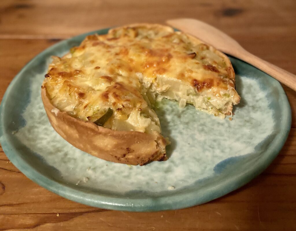 I love the simple comfort of this hearty and filling pie. It is perfect for a chilly night, served simply with a salad or even a bowl of soup. The tender potatoes and layers of allium flavors paired with a tangy aged cheddar cheese give this simple pie depth and dimension much deeper than the short ingredient list. Do seek out an aged cheddar – they are easy to find nowadays – you want that strong bite. Some recipes call for a crust made with whole wheat flour, and you can certainly do that, but frankly I like the simplicity of using a purchased, rolled pie crust. I love the homely look of cooking this in a springform pan, plus you can create a nice deep crust, but a pie plate or tart pan works too.