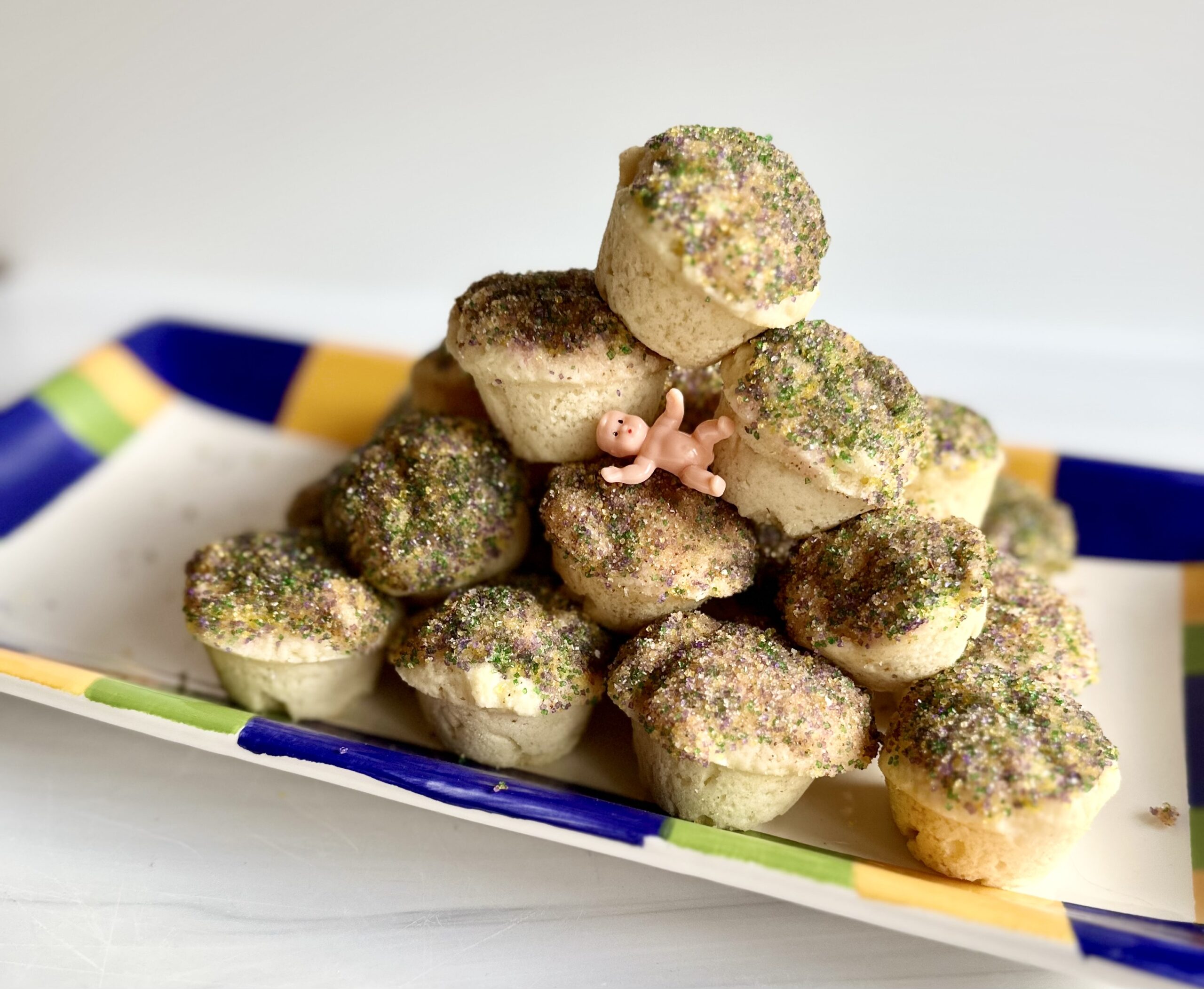 I find colored sanding sugar at most grocery stores, but you can also order them online. I bought a set that came with some plastic babies for king cake! I mix mine up for a confetti of color, but you could easily do separate colors for a rainbow of muffins. And for other occasions like Easter or Christmas, you can use different colors with the same recipe. You can dip the whole muffin in butter and roll completely in the sugar, but I find too much sugar sticks to your fingers when eating them! Serve these warm from the oven or at room temperature, but make them the day you will eat them.