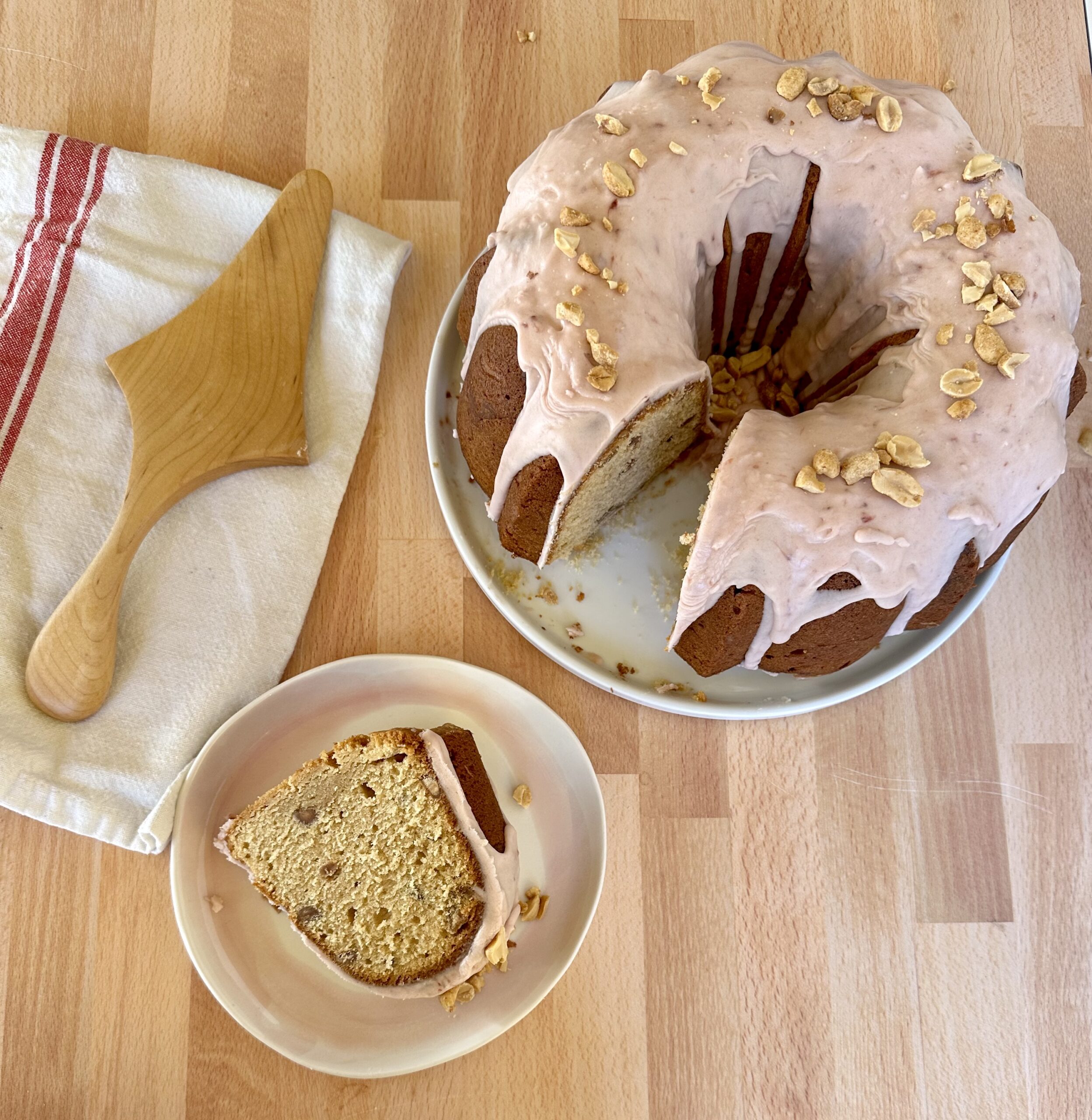 I can’t think of a more home comfort dessert than pound cake with the classic flavors of a peanut butter and jelly sandwich. It’s one of my very favorite flavor combinations. I love it in a chess pie or a sheet cake. I eat a peanut butter sandwich for lunch most days. In the form of a pretty molded Bundt cake with a traditional glaze tinted a lovely pink, this recipe levels up to a sophisticated dessert with a touch of whimsy. That’s not to say a slice of this in your lunch box is a bad idea!