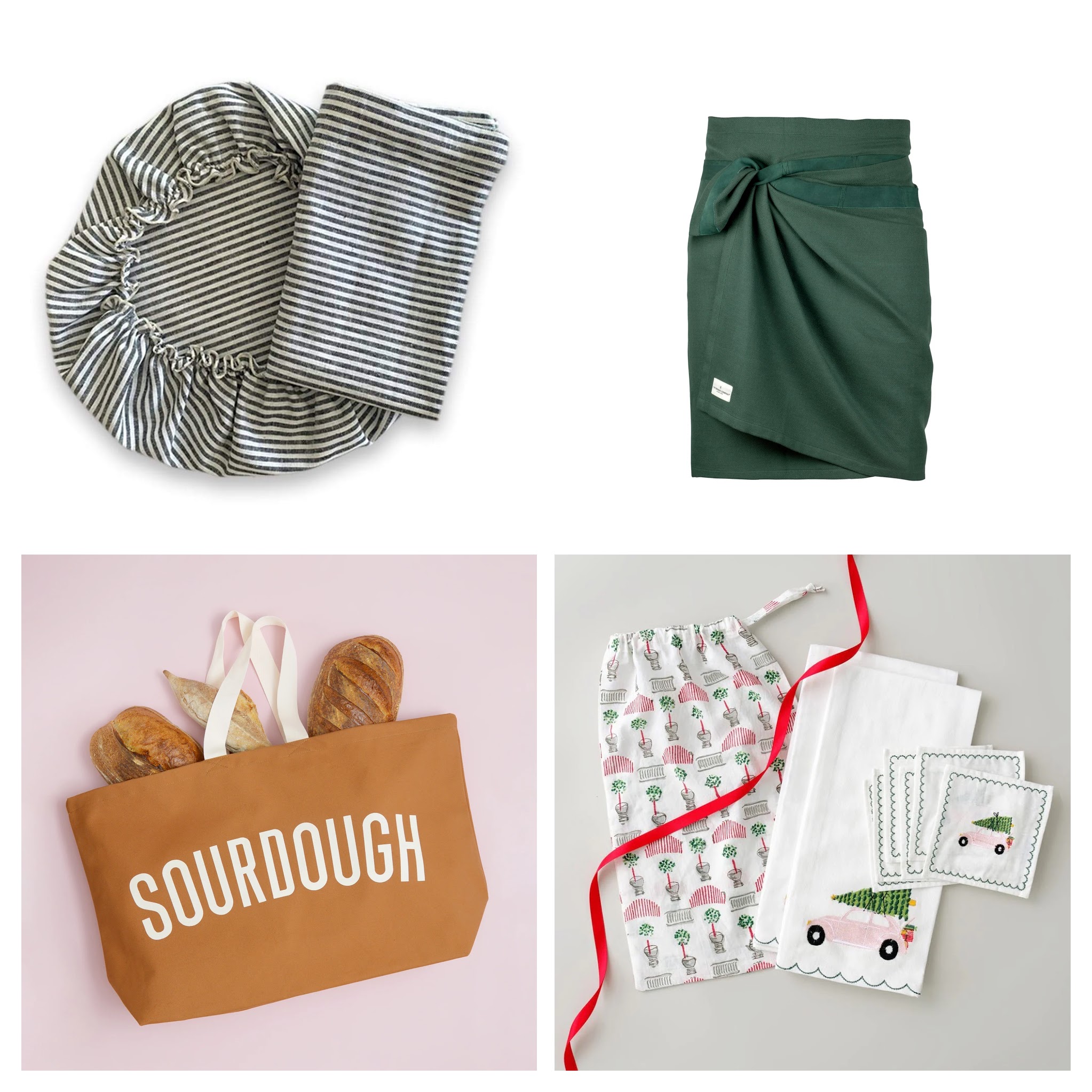 If someone on your list took up the whole pandemic bread baking thing, this lovely set of linen bowl cover and storage bag are perfect. Or a giant tote bag that proclaims their love for sourdough. And I love this giant kitchen towel apron that wraps around your waist. This lovely little gift sac with tea towels and cocktail napkins makes a very festive happy.