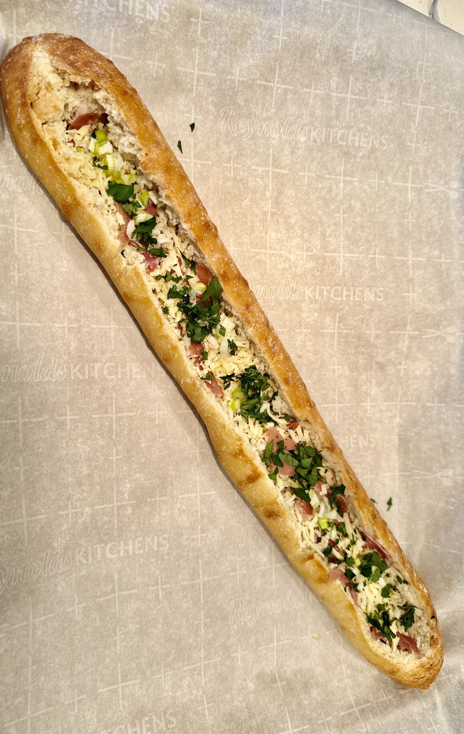 - Tear the prosciutto into small bite size pieces and distribute it evenly over the bottom of the opening, then top with most of the gruyere. Sprinkle the green onions and most of the parsley evenly on top. Crack the eggs into a measuring jug with a pouring spout, add the cream and some generous sprinkles of salt and grind of pepper and whisk to completely combine. Slowly, slowly pour the egg over the ingredients int the channel of the bread. Go very slowly, letting the egg settle and distribute before adding more. You really want to avoid egg spilling over the sides of the bread. You may not use all of the egg. Sprinkle a little more cheese and parsley on the top and a sprinkle of salt and pepper. Let the loaf settle for a few minutes, then carefully transfer to the oven and bake at 350 degrees for 20 – 25 minutes until the egg is fully set, with no liquid visible It will puff up in the center. If the bread is browning too quickly, you can loosely cover it with another piece of parchment paper.