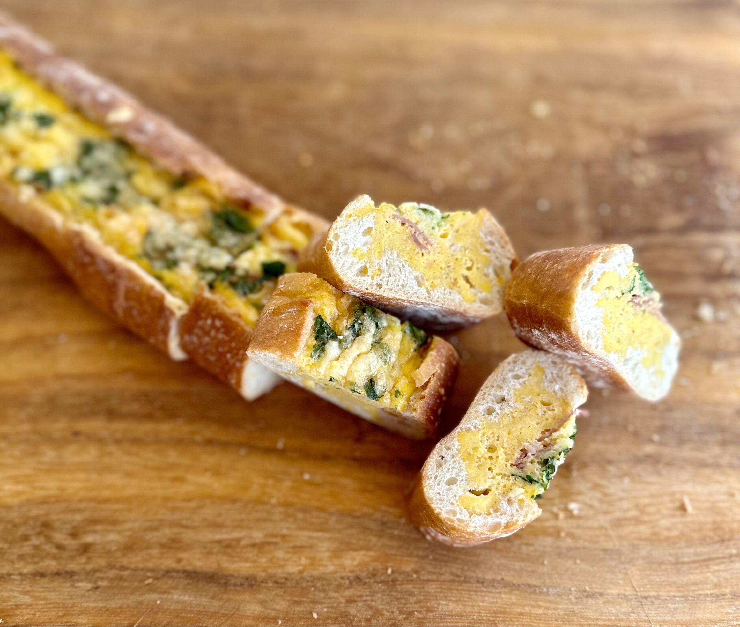 Sometimes you see an image of a dish online or in a magazine and it is so pretty and seems so simple that you rush out to recreate it. And it is a huge disappointment. Either the taste is awful or it was not at all as easy as it seemed, or it just isn’t very pretty. I think there is a whole Pinterest fails community that addresses this. Let me tell you though, this is not one of those. It works, it’s easy and it looks amazing. I saw a version of this, in a much thicker loaf of bread with all sorts of add-ins years ago – I think maybe even before the rise of Instagram. My mind went to something much simpler (the original had tons of cheese and sausage and bacon and whatnot). A thin baguette filled simply with eggs and a few key players. I developed this over the years to a simpler version with the ingredients of a classic quiche Lorraine, and I think it is a stunner. I don’t know that it is something French cooking purists would accept, but it strikes me as the kind of simple, stunning dish effortlessly laid on the battered wooden table of a French country kitchen or carried out to the fragrant, wild garden. I aspire to, but rarely achieve, that kind of thing.