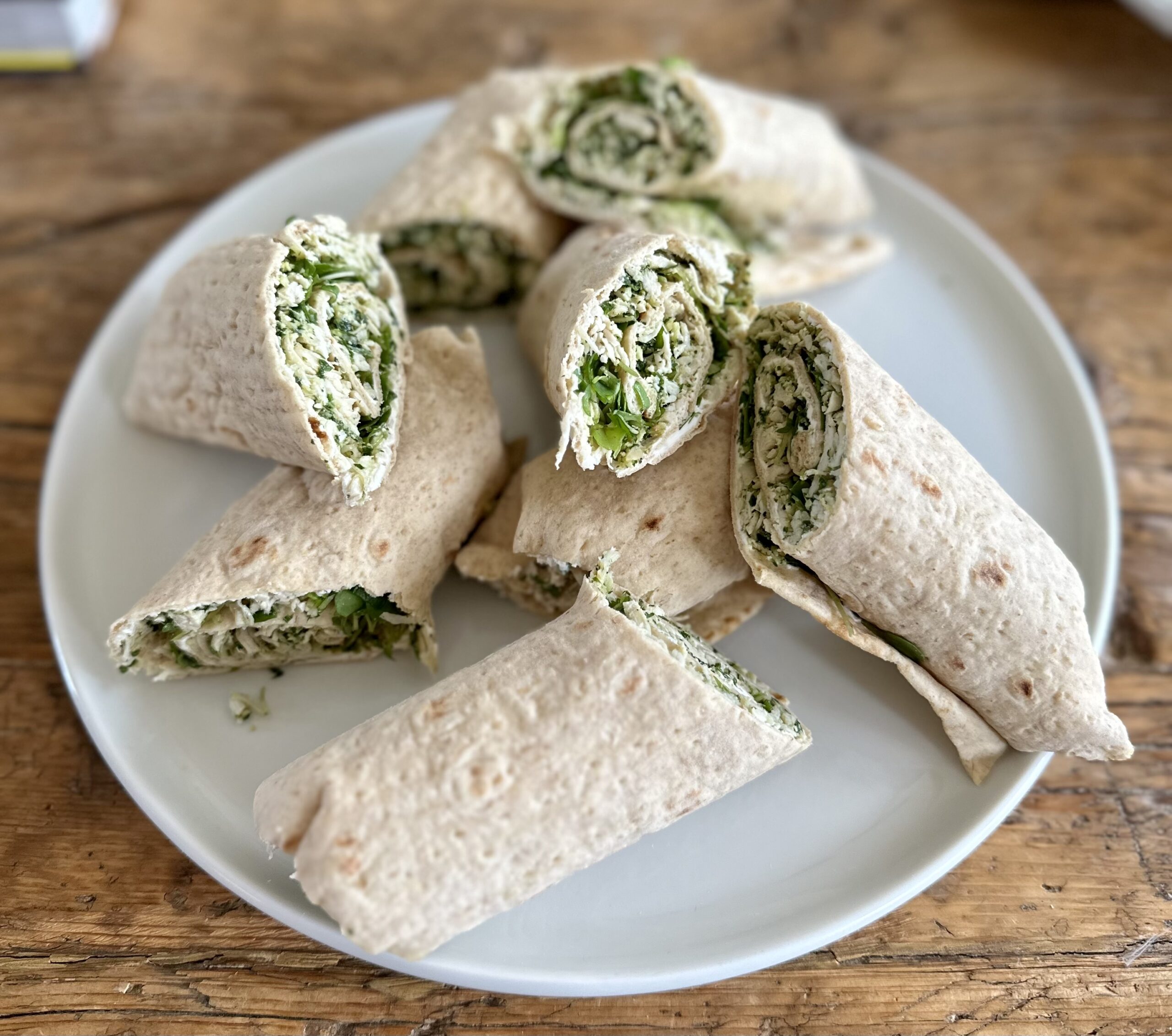 I have called myself a chicken salad savant before, because I love chicken salad in its many, many forms. So here I take a trip to the Med, with this herb-forward, light and tangy version. Zhoggiu (pronounced zah-dew) is a Sicilian pesto that shows the Mediterranean crossroads heritage of the Italian island, creating a wonderfully flavorful sauce with a Middle Eastern twist and Italian sensibility. It is perfect coating shredded chicken. That alone is an amazingly light and fresh chicken salad on its own or on top of salad greens, but I love it tucked into a wrap. A thin layer of thickened yogurt adds a nice tangy creaminess. These wraps are a marvelous spring or summer lunch and are even perfect for a picnic.