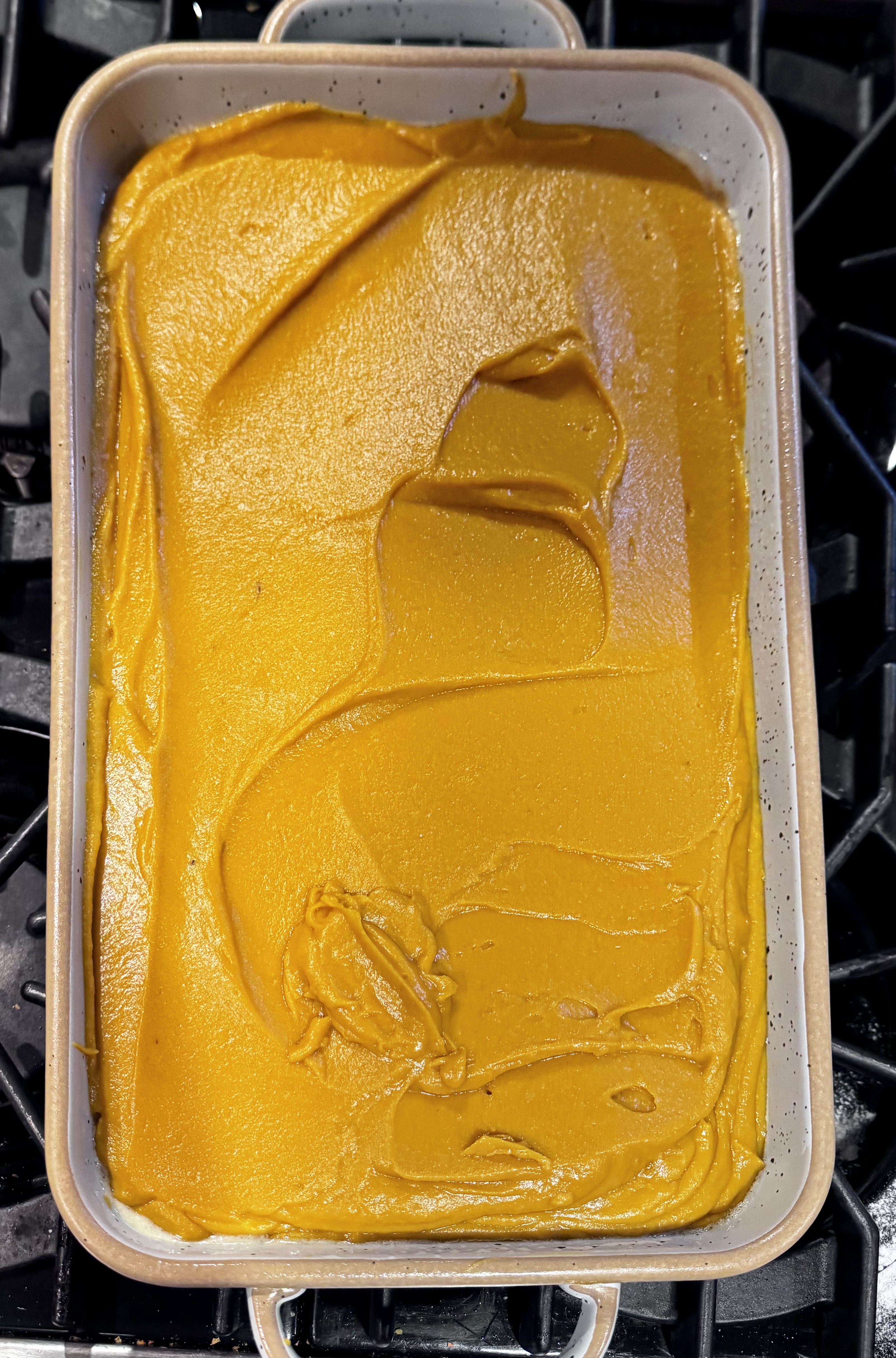 - When the potatoes are ready and peeled, put the eggs, sugar, milk and salt in the bowl of a food processor and process for about 30 seconds, until completely blended and the sugar has almost dissolved. Add the sweet potato flesh, breaking it up with a spatula or your hands, and process until smooth and combined. Add the sorghum and brown butter and pulse to combine. Add the flour and baking powder and blend just until combined and smooth. Don’t blend too long, just make sure no dry streaks of flour are visible. Spray a 9 by 13 baking dish with cooking spray, then scrape the potato mixture into it and spread it to an even layer.